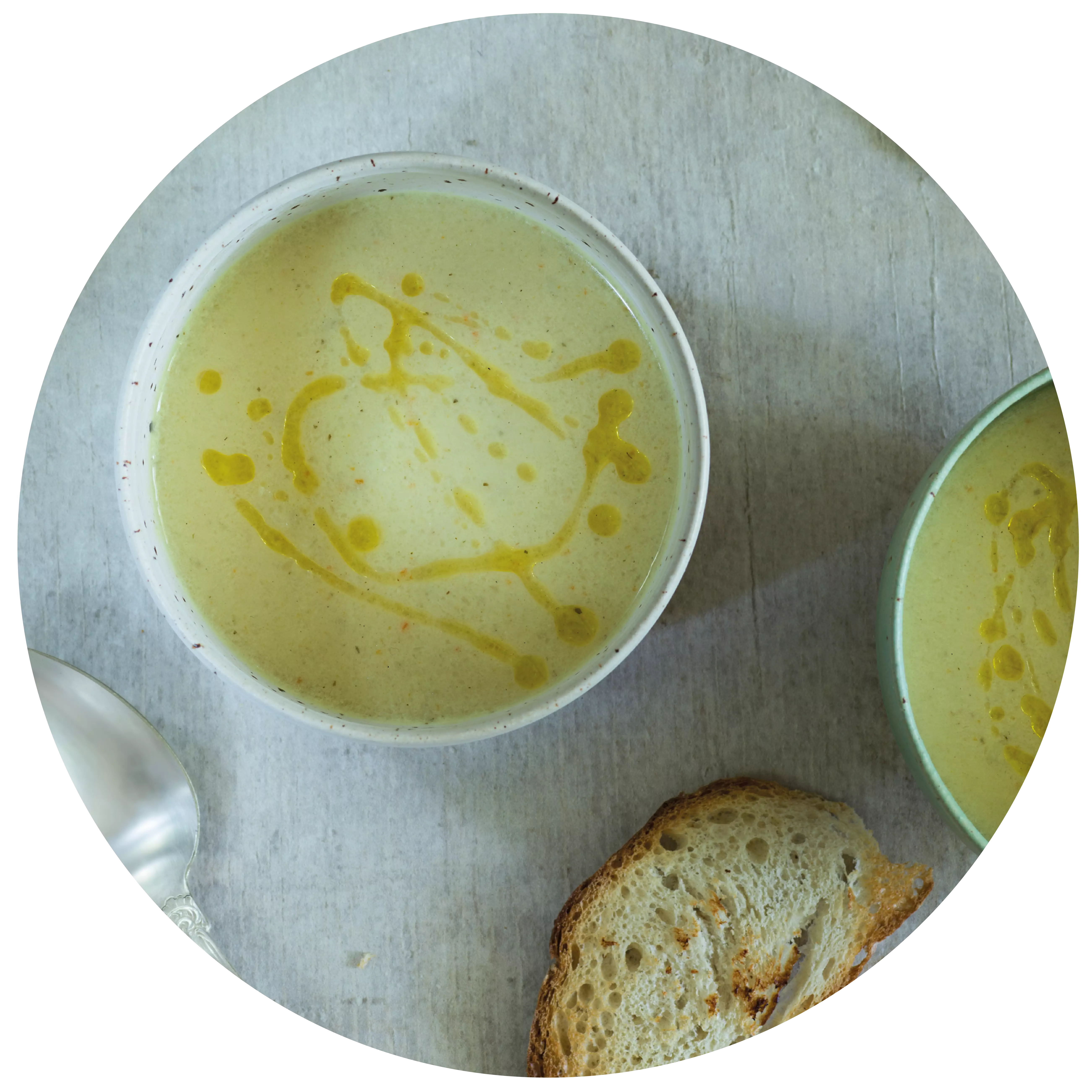 Kevyt ja samettinen kukkakaalikeitto, jossa makua antavat salottisipuli, fenkolinsiemenet, valkoviini ja kerma. Tarjoillaan oliiviöljyllä koristeltuna.