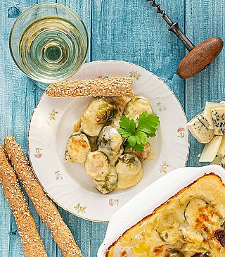 Tarjoa kolmen juuston ruusukaalit heti kuumana, grissini-leipätikkujen kera.