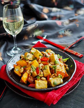 2. Avaa tofupaketti, valuta neste, viipaloi tofu ja laita talouspaperin väliin kuivumaan painon alle 10 minuutiksi. Kuutioi viipaleet ja pane ne kuumalle ja kuivalle paistinpannulle ja anna ruskistua. Lisää lopuksi seesaminsiemenöljy. Pane kuutiot sivuun odottamaan kastikkeen valmistumista.