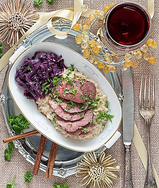 Kasaa annokset: Pohjalle ohrattoa, hanhenrintaa ja päälle punakaalia. Koristele persiljalla. Tarjoa heti.
