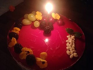 Karhunvatukoita, viinirypäleitä( tummia&vaaleita), keltaisia syötäviä orvokeita, sulasta valkosuklaasta piirretty/pursotettu viinirypäleköynnös, sekä sitruunamelissan lehtiä.
