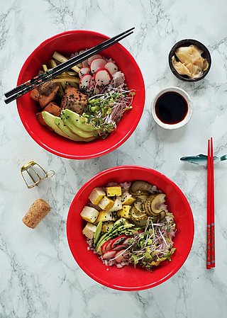 5. Jaa huoneenlämpöinen sushiriisi neljään annoskulhoon. Lado riisille sektoreittain täyteaineita. Jos käytät tofua, sushikulho on vegaaninen.