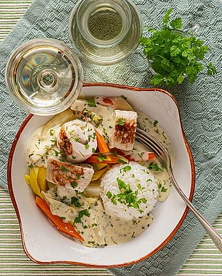 Viinisuositus: valkoisen lihan ja creme fraichen kanssa yhdistyvät hyvin esim. puolikuiva Riesling.