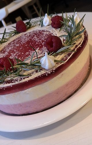 Koristeltu valkosuklaalla, vadelmilla, mantelijauheella ja tuoreella rosmariinilla.