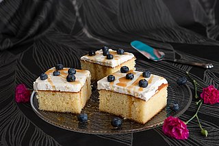 4. Vatkaa kerma vaahdoksi ja mausta se sokerilla ja hienonnetulla mesiangervolla. Levitä vaahto kakun pinnalle. Leikkaa kakku halutessasi ruuduiksi. Koristele pensasmustikoilla ja appelsiinisiirapilla juuri ennen tarjoilua.