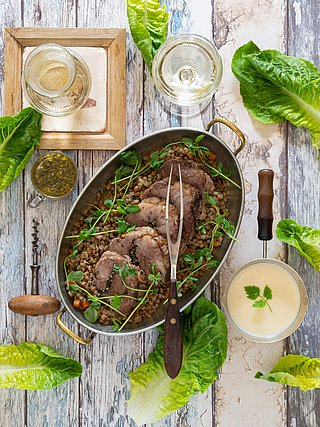 Viinisuositus: Saksalainen Silvaner, esimerkiksi vanhoista köynnöksistä tehty Brennfleck Sulzfelder Sonnenberg Silvaner Alte Reben.
